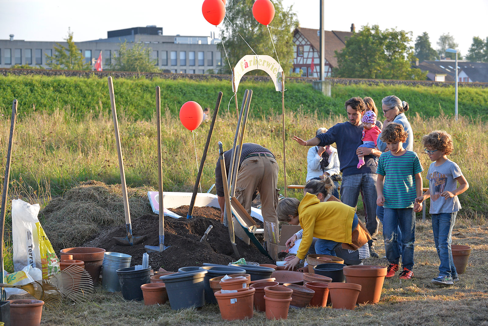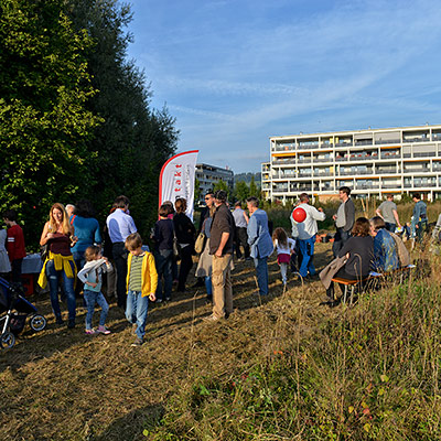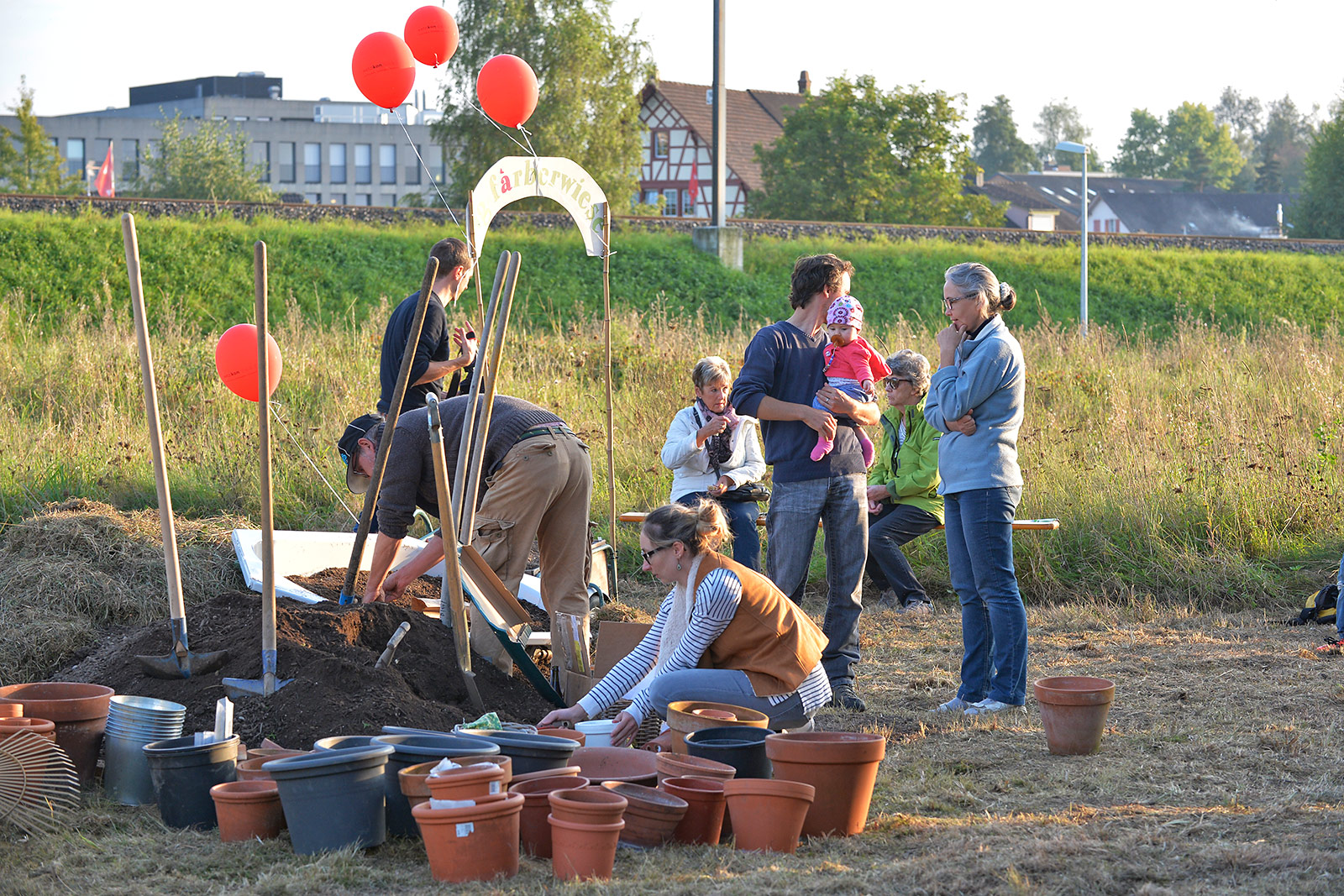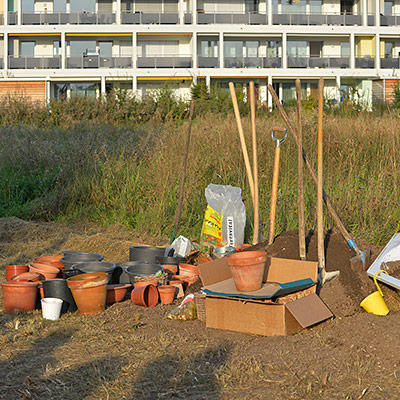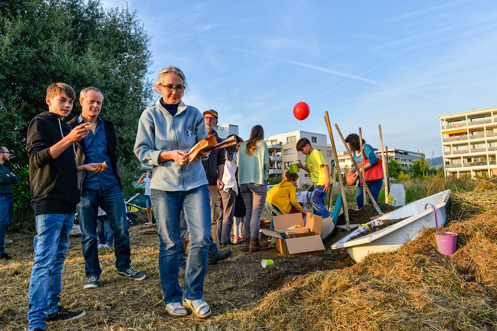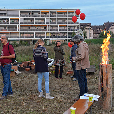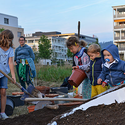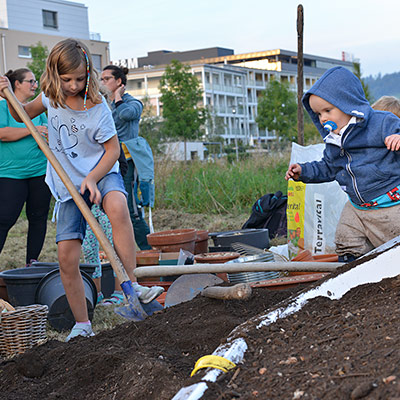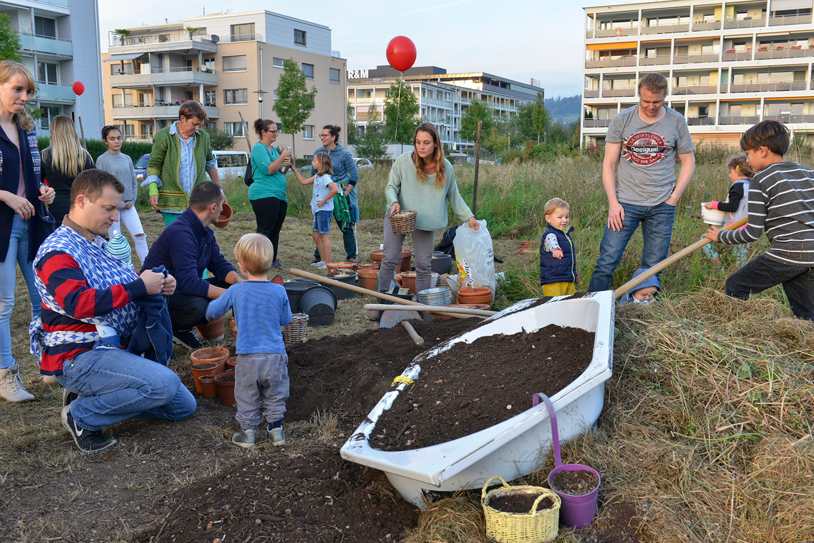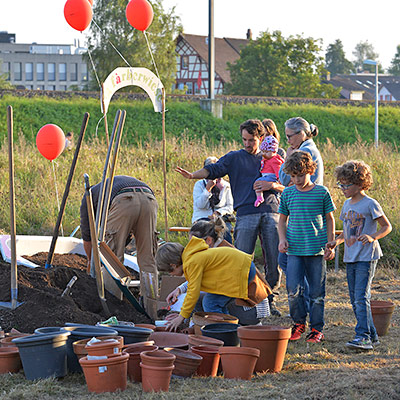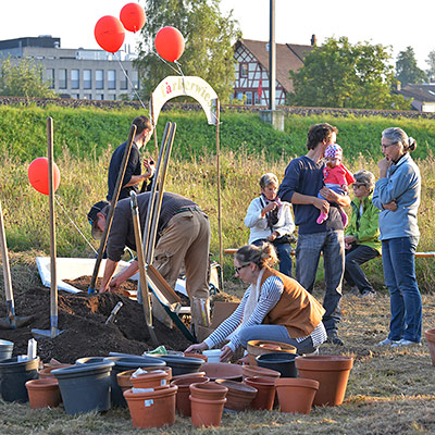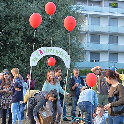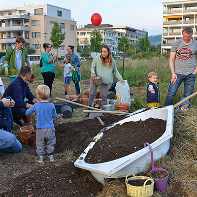 Eine bunte Gruppe von Anwohnern jeglichen Alters traf sich zum vergnügten Blumenzwiebeln pflanzen und einem Apéro. Der erste Schritt ist getan, auf das der Garten gedeihe!