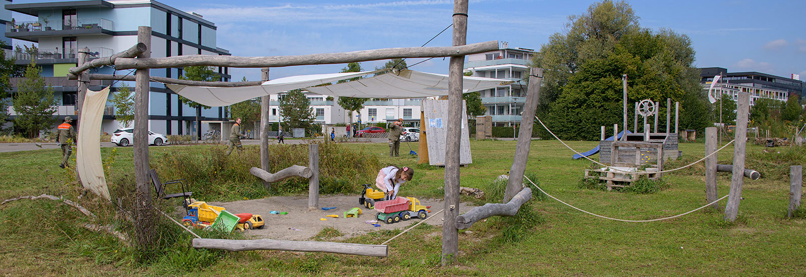 Der Spielplatz, ein Begegnungsort für Jung und Alt. Während sich Kinder beim Sändelen, Schaukeln und Spielen vergnügen. können sich ältere Menschen und die Betreuungspersonen auf den Sitzbänken gemütlich niederlassen.